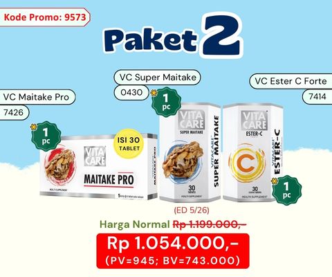 Promo Harga Murah "Vitacare Maitake Pro (1 pc), Vitacare Super Maitake ED 5/26 (1 pc), Vitacare Ester C Forte (1 pc)."
