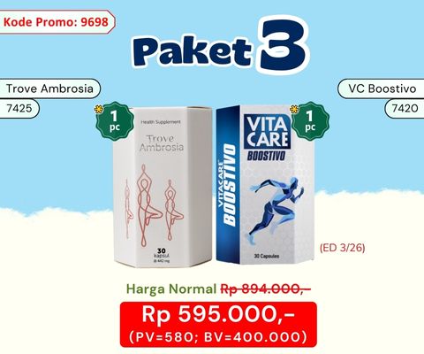 Promo Harga Murah "Trove Ambrosia (1 pc) dan Vitacare Boostivo ED 3/26 (1 pc)."